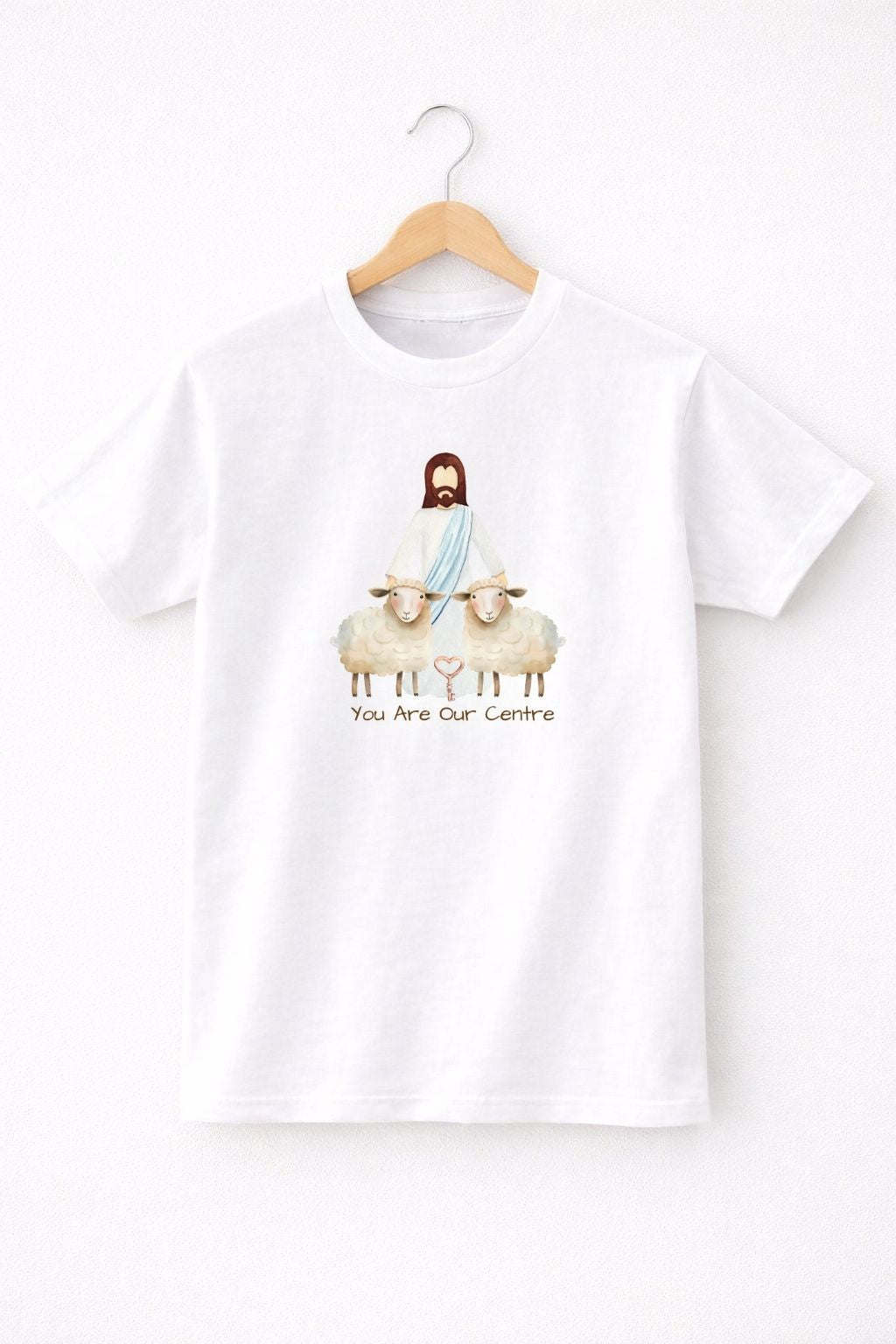 本設計以家庭與信仰為靈感,描繪出主耶穌站在兩隻綿羊中間,如同牧人從身後守護著牠們。